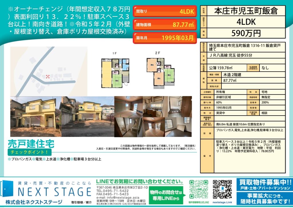 | 特記事項 | 表面利回り13.22%!!駐車スペース3台以上!令和5年2月(外壁屋根塗り替え・ポリカ屋根交換済み)、プロパンガス・浄化槽・上水道・東京電力 | ||